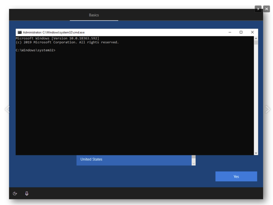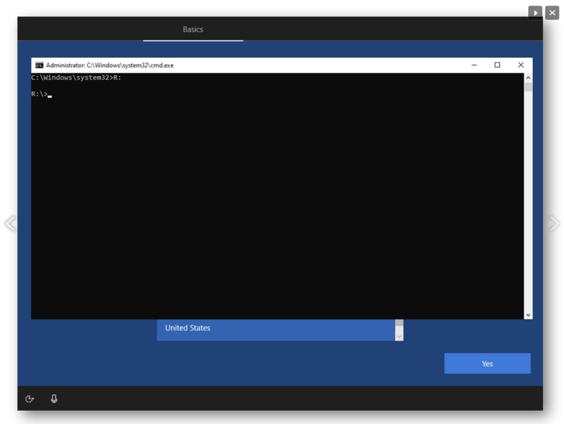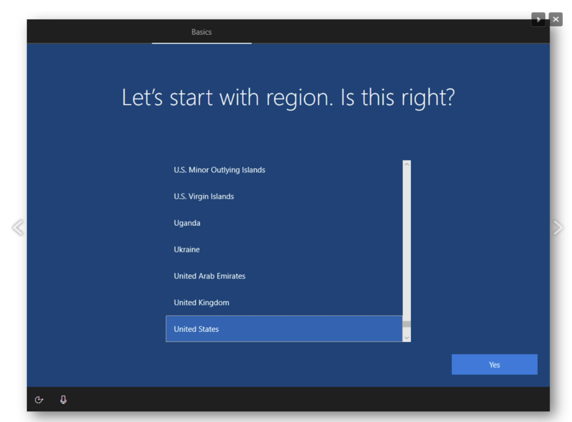 Now on your new computer, attach your USB drive to it. We don’t need to boot from the USB, we just need it to be available for us to use. When we first turn on the computer we should be greeted with the region information or something similar. This means we are in the out of box experience.