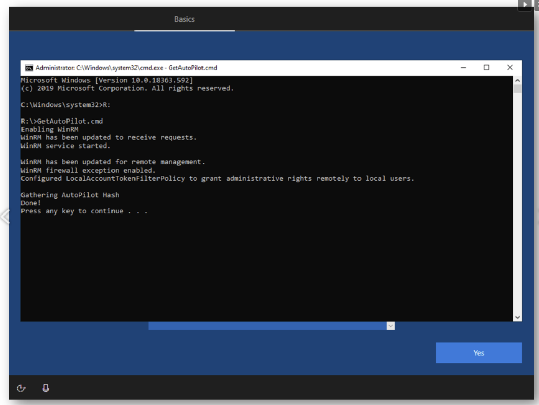 Step 10: The last step we need to do is to run the CMD script. So, in your command prompt just type GetAutoPilot.cmd and then press ENTER. Once it is finished running I can simply turn off the machine until I finish importing the hash into Auto Pilot, the next time it boots it will still be at the OOBE process, but since I would have imported the hash and assigned an Auto Pilot profile, it will automatically go through the Auto Pilot process.