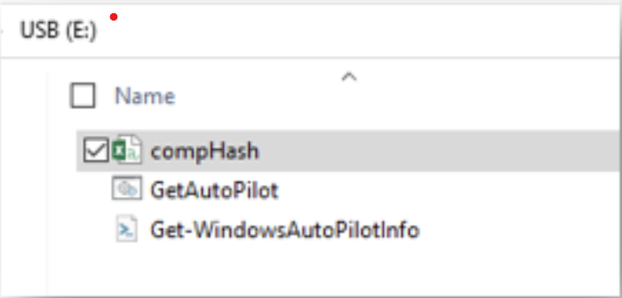 Step 11: If we were to plug the USB back into our main machine we can now see there is a CSV on there called compHash, and it contains our AutoPilot hash for our machine. We can either upload this into our Auto Pilot in Azure, or run this on other machines as it will keep appending the csv file.