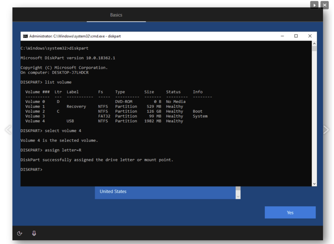 Step 6: Next, we need to figure out the drive letter for our USB drive. Enter DISKPART and then list volume. In my example, my USB drive did not get a drive letter so I will select my USB volume (volume 4) by running select volume 4, and then assign it drive letter R by running assign letter=R