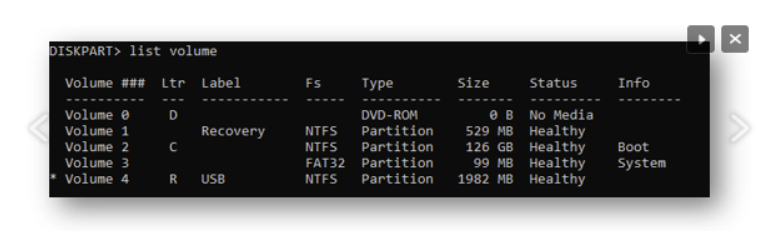 Step 7: By running list volume again I can now see my USB drive has the letter ‘R’ assigned to it