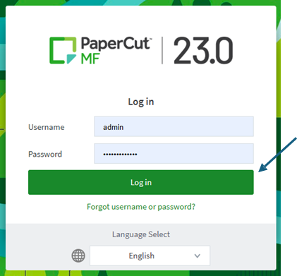 Step 2. Enter the login credentials below for the PaperCut Administrator account and press Log in: